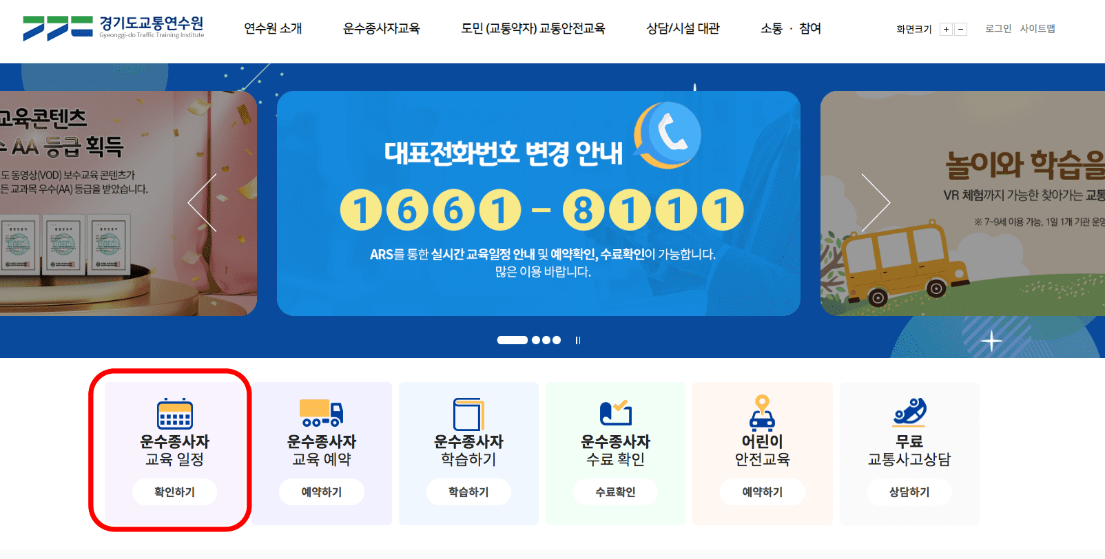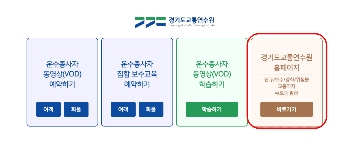 먼저 경기도 교통연수원 홈페이지에서 온라인 신규 또는 보수 교육을 예약하시려면 아래의 링크를 통해 이동하시기 바랍니다.
