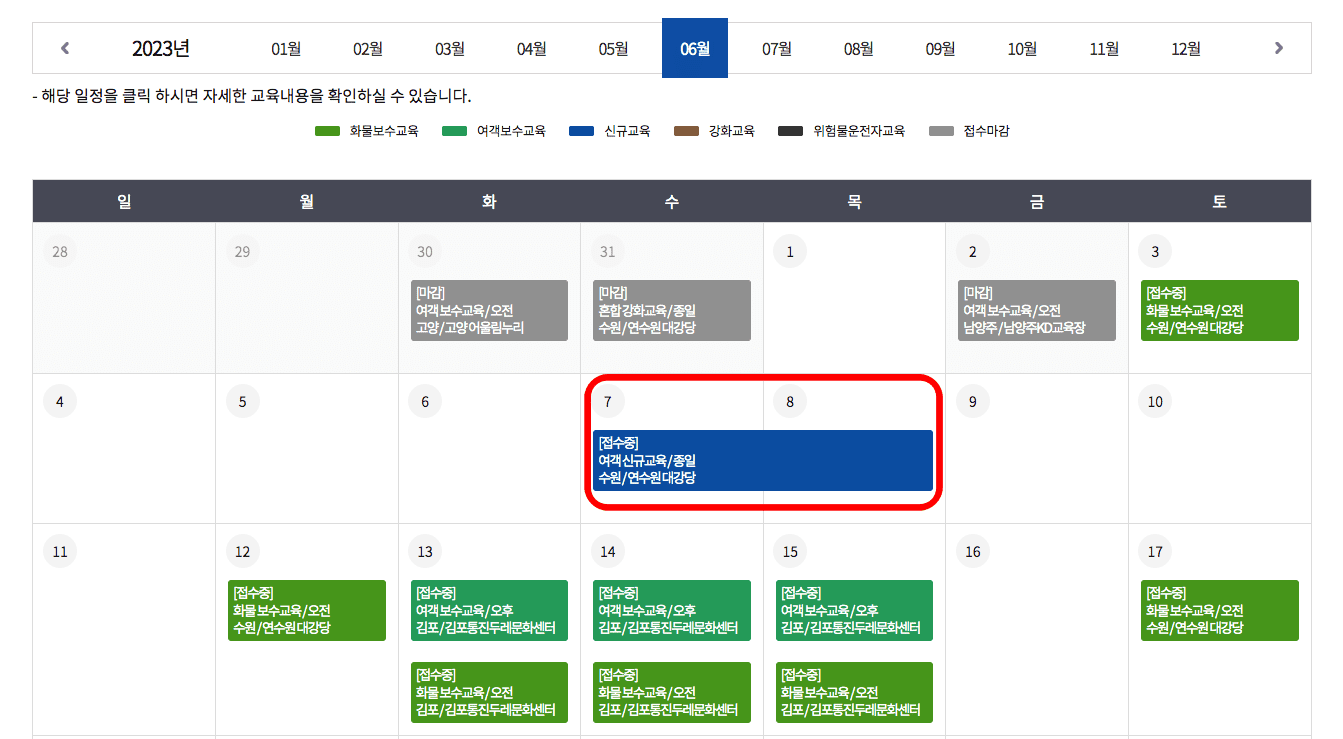 표시된 달력에서 화물보수교육, 여객보수교육, 신규교육, 강화교육, 위험물운전자교육 등 자신에게 해당하는 교육을 클릭합니다.