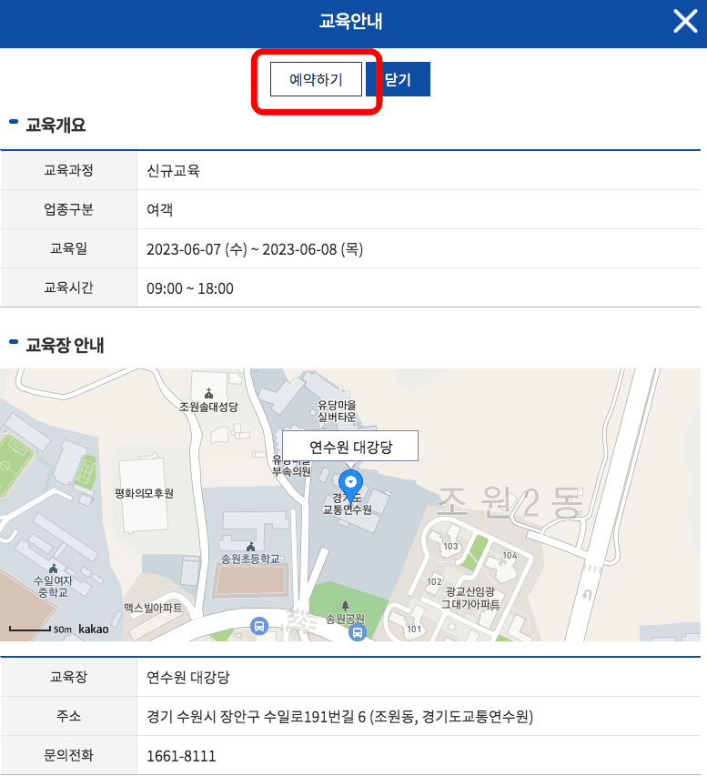 교육안내 페이지 상단의 예약하기 버튼을 클릭하면 예약이 완료됩니다.