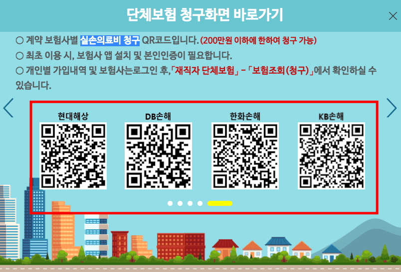 이후 계약 보험사별 실손의료비 청구 QR코드를 확인하시고 보험사 앱 설치 및 본인인증 후 청구가 가능합니다.