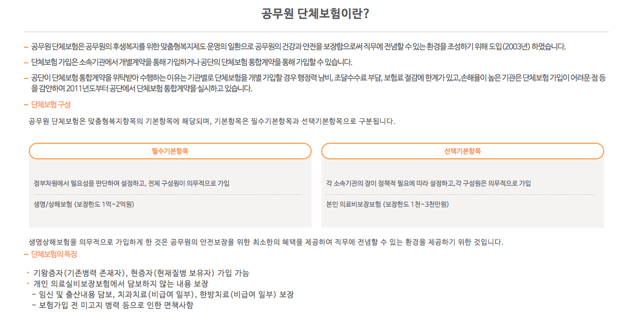 공무원 단체보험은 공무원의 후생복지를 위한 복지제도의 일부로 공무원의 건강과 안정 보장을 위해 도입되었습니다. 단체보험 가입은 소속기관에서 개별계약을 통해 가입하거나 공단의 단체보험 통합계약을 통해 가입이 가능합니다. 단체보험은 필수기본항복과 선택기본항목으로 나누어져 있으며 보장한도 최대 2억 원까지 수령가능합니다.