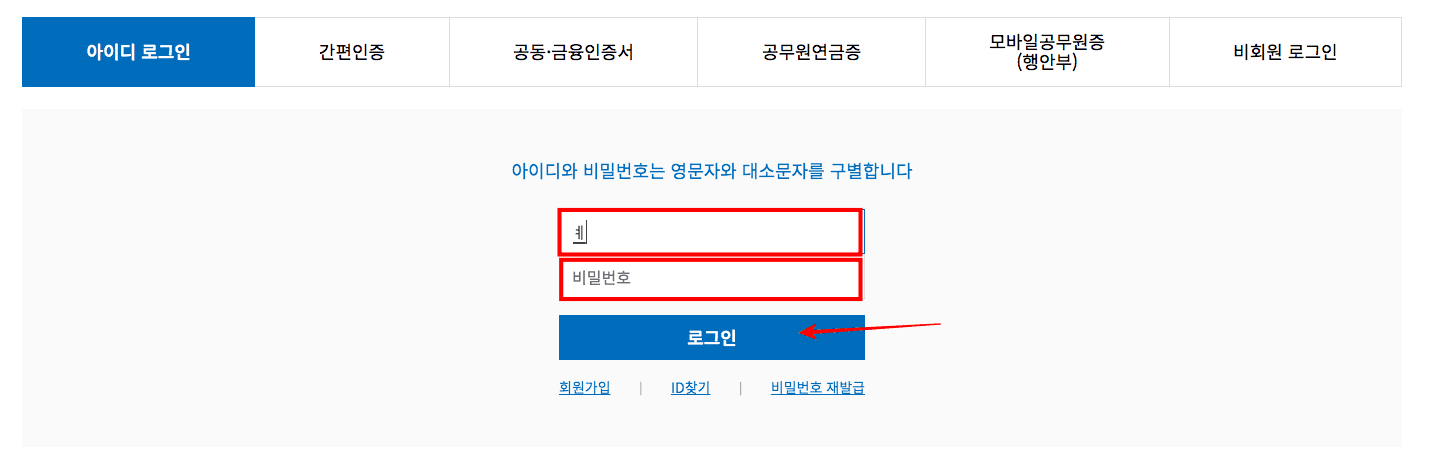 이미 회원가입이 되어 있으시다면 아이디, 간편 인증, 공동 및 금융인증서, 공무원 연금증, 모바일 공무원증으로 로그인이 가능합니다.