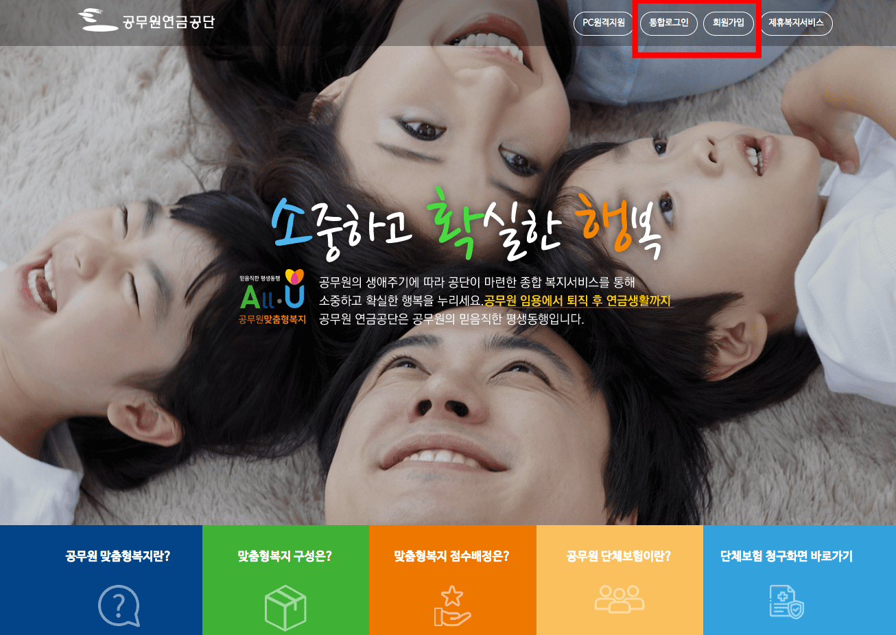 교직원 맞춤형복지포탈사이트에 방문하시면 위와 같은 페이지를 볼 수 있습니다. 홈페이지 상단의 회원가입 또는 통합 로그인 메뉴를 클릭합니다.