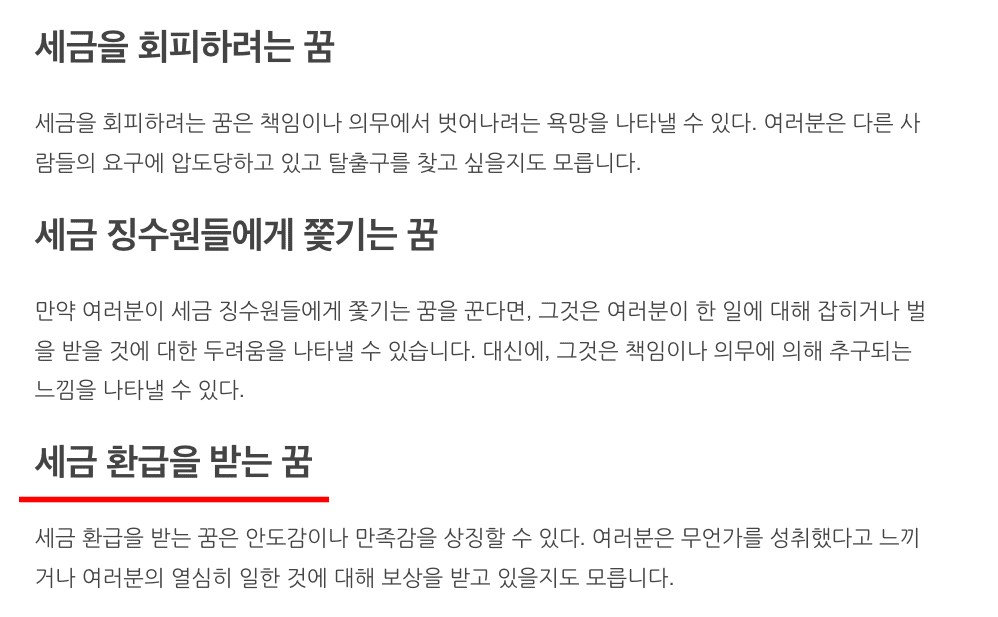 최근 꾼꿈으로 세금 환급을 받는 꿈에 대해서도 조회해 보았습니다. 세금 환급을 받는 꿈은 무엇인가를 성취하거나 열심히 일한 것에 대한 보상을 받는다는 것을 의미합니다.