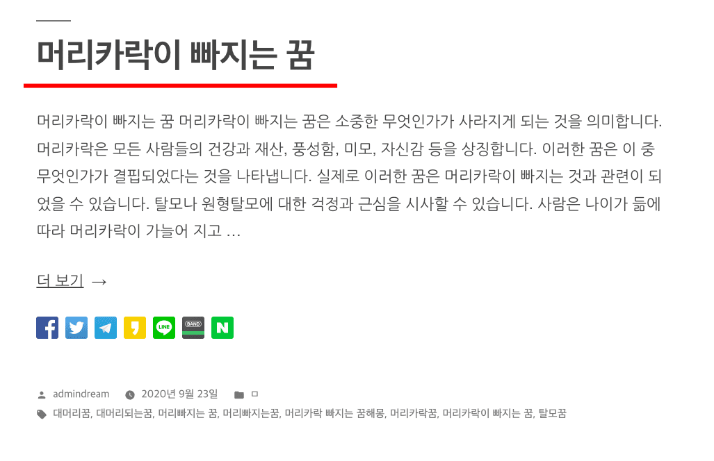 다음으로 머리카락이 빠지는 꿈에 대해 검색해 보았습니다. 머리카락이 빠지는 꿈은 소중한 무엇인가가 사라지게 되는 것을 의미한다고 합니다.