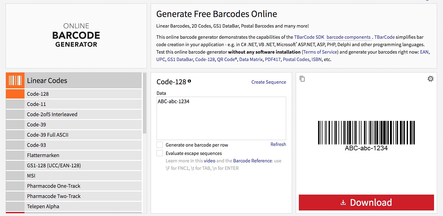 먼저 가장 기본적인 바코드 생성 방법을 알아보도록 하겠습니다. 사이트의 좌측 메뉴에서 Linear Codes를 선택합니다. 이후 Code-128을 선택한 후 가운데 메뉴에서 DATA 값을 입력합니다. 알파벳 대문자와 소문자 숫자로 바코드의 값을 입력할 수 있고 우측 메뉴에서 Download를 클릭하시면 바코드 이미지 파일을 다운로드할 수 있습니다.