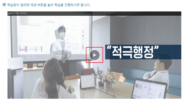 학습하기 버튼을 클릭하여 강의실로 이동합니다. 학습창이 열리면 재생버튼을 클릭하여 학습을 진행할 수 있습니다.