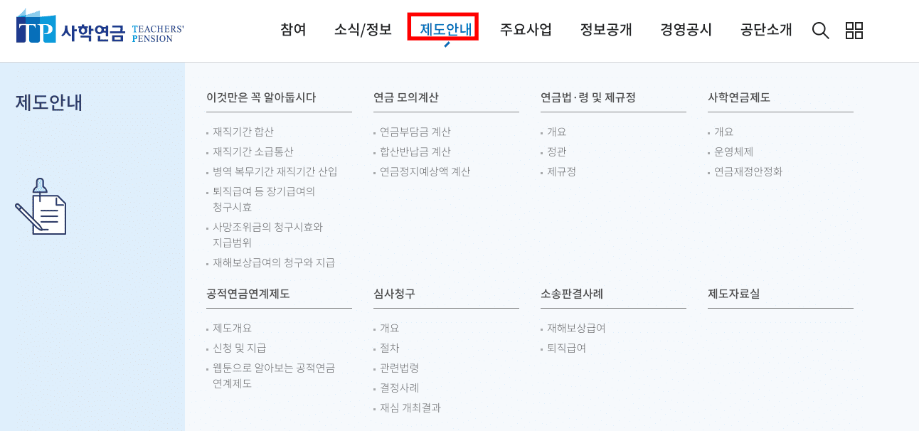 사학연금관리공단 홈페이지 가입이나 로그인이 완료되었으면 상단 제도안내 메뉴로 마우스를 올려두시면 연금 모의계산, 연금법, 사학연금제도, 공적연금연계제도, 심사청구, 소송판결사례 등의 정보를 조회할 수 있습니다.