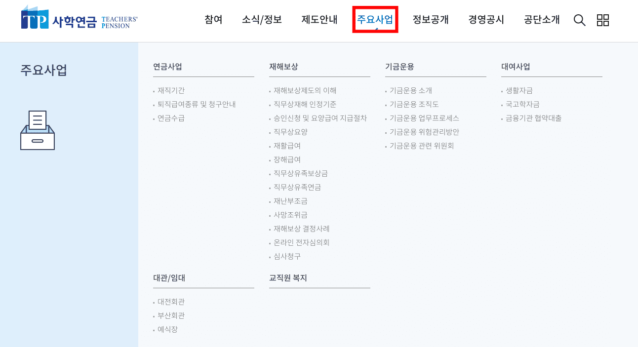 상단 메뉴 주요 사업으로 마우스를 올려두시면 연금사업, 재해보상내용, 기금운용, 대여사업, 대관 및 임대에 관한 정보를 조회할 수 있습니다.