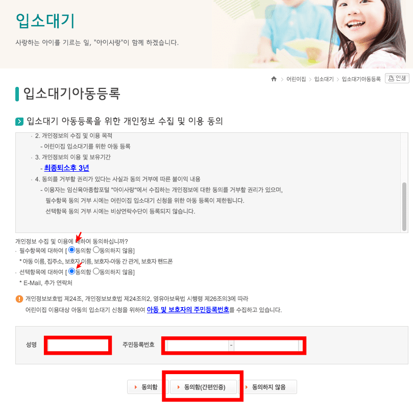 로그인 후 다시 입소대기 페이지로 이동하면 입소대기 아동등록을 위한 개인정보 수집 및 이용동의에 동의 표시를 하시고 하단에 성명과 주민등록번호 하단에서 동의함을 클릭합니다.