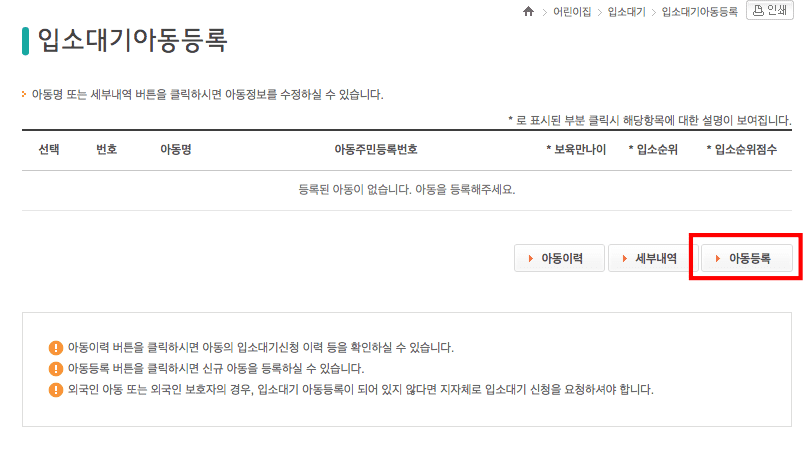 인증 후 입소대기아동등록 페이지가 표시됩니다. 아직 아동 등록이 되어 있지 않다면 우측 하단의 아동등록 버튼을 클릭합니다.