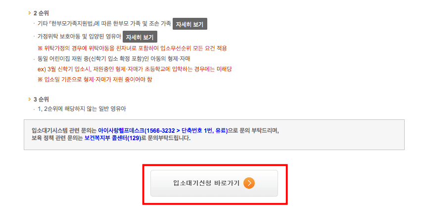 해당 내용이 표시되면 스크롤을 하단으로 내려 ‘입소대기신청 바로가기’버튼을 클릭합니다.