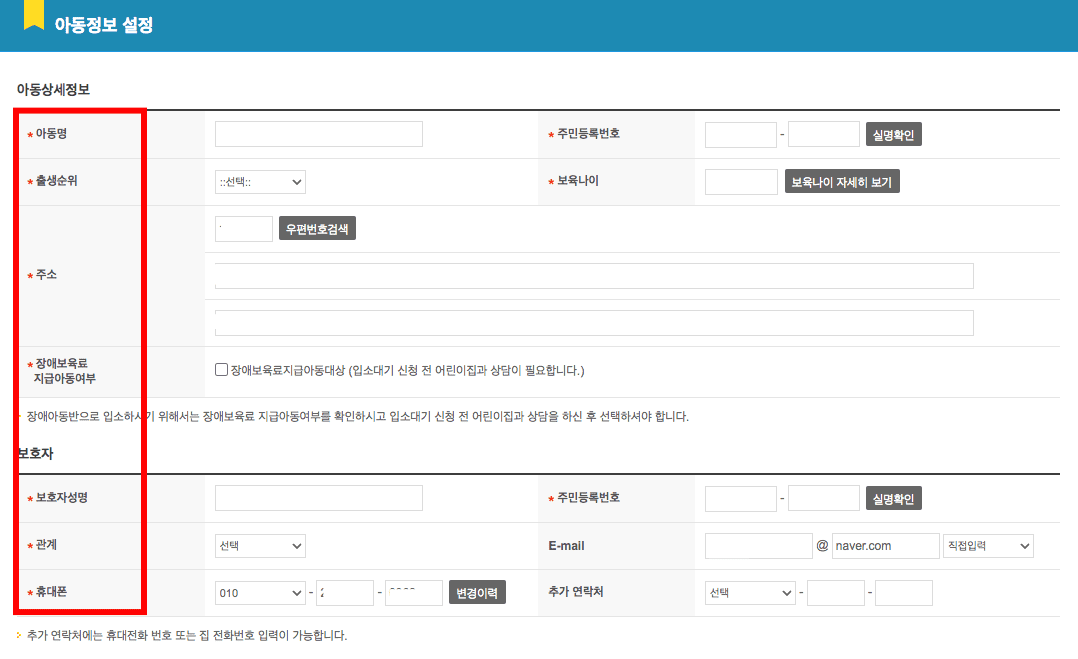 아동정보 설정의 별표시된 주요 정보를 모두 입력합니다.