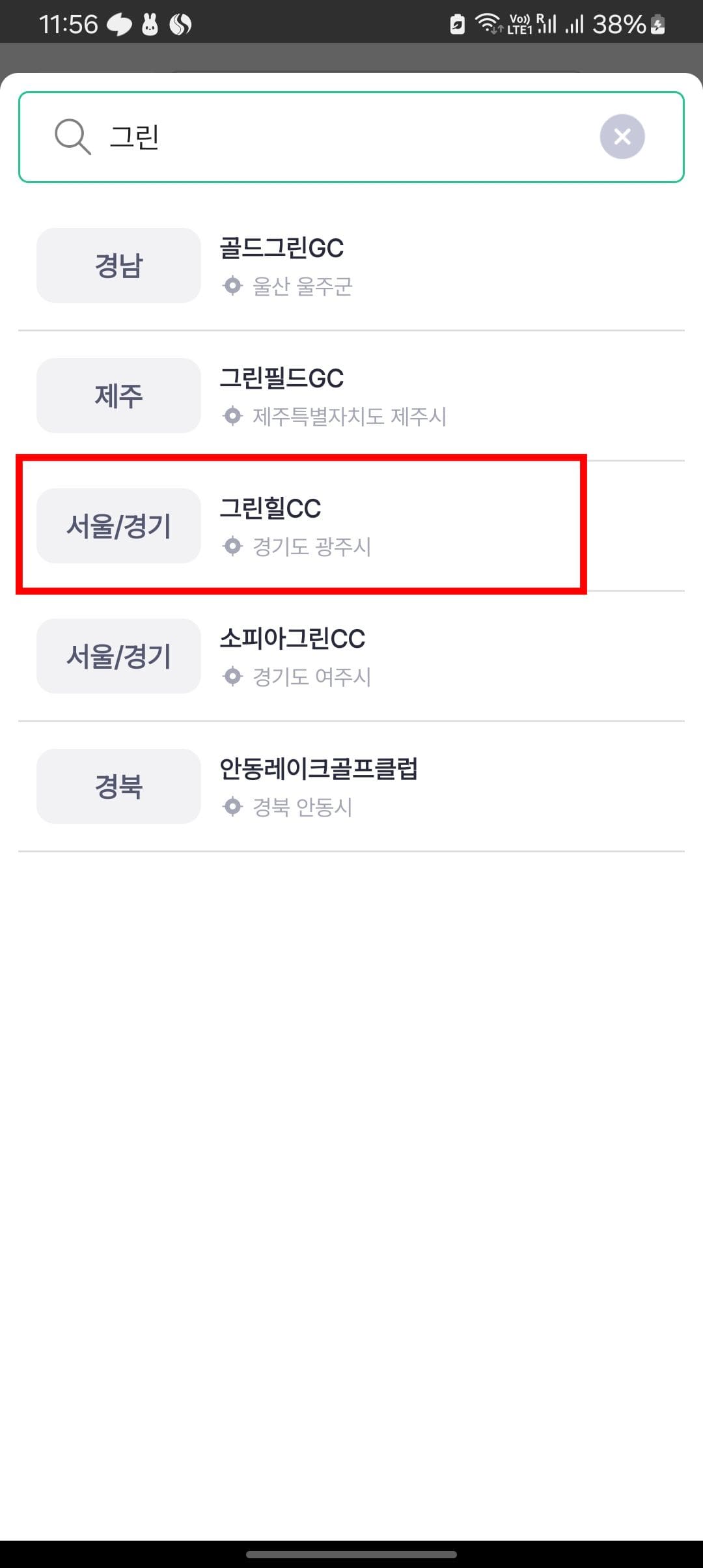 상단메뉴에서 지역을 선택하시고 하단에서 날씨를 알고 싶은 골프장을 선택합니다. 여기에서는 그린힐을 선택해 보았습니다.