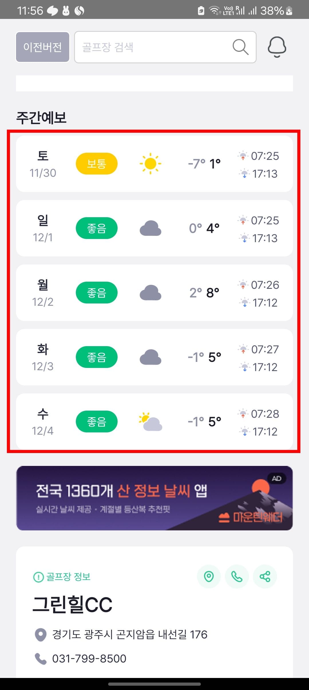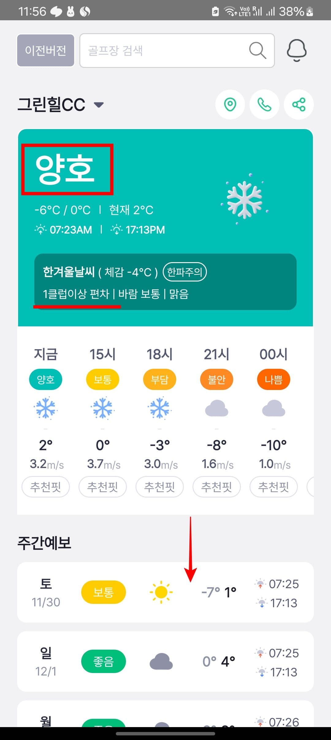 그린힐CC의 오늘 날씨는 골프를 하기에 양호하다고 표시됩니다. 1 클럽이상 편차가 나온다는 것도 알려줍니다. 스크롤을 내려 주간예보를 확인하시면 5일간의 날씨를 확인할 수 있습니다.