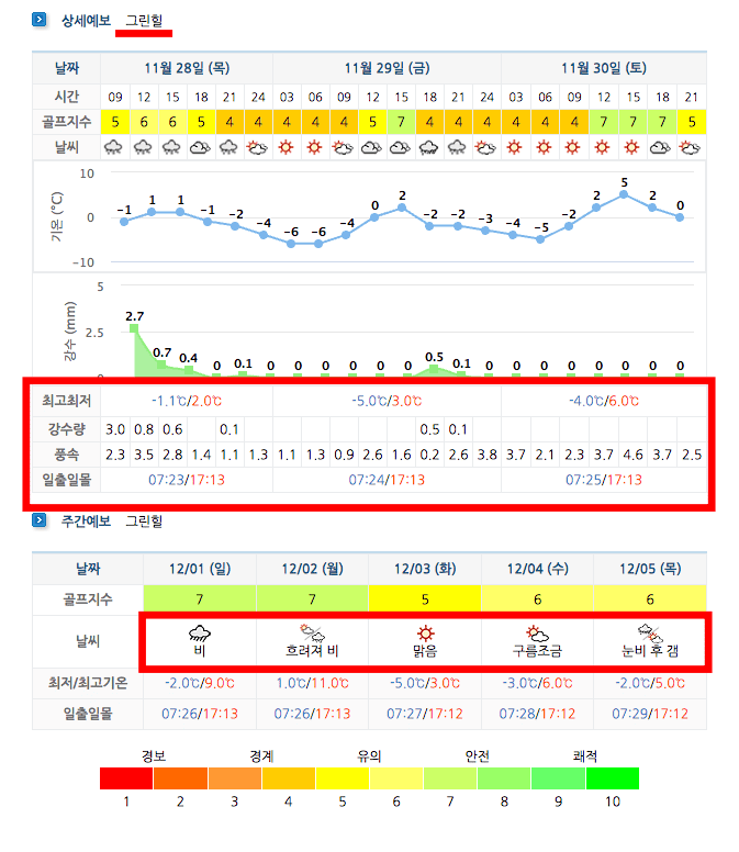 결과를 확인하시면 상세예보에서 최근 3일간의 최고최저 기온, 강수량, 풍속, 일출일몰 시간을 확인할 수 있습니다. 주간예보에서는 3일 후 5일간의 날씨와 최저 최고 기온, 일출일몰 시간을 확인할 수 있으며 골프지수를 통해 숫자가 높을수록 라운딩 하기에 좋은 날씨라는 것을 확인할 수 있습니다.