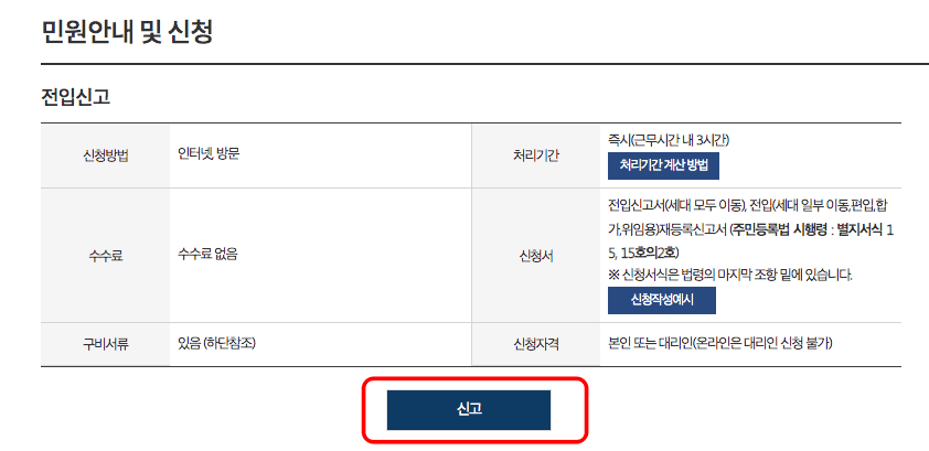 전입신고 민원안내 페이지가 표시되면 아래의 신고 버튼을 클릭합니다. 회원이거나 비회원 로그인을 선택하시고 인증하시면 전입신고 절차가 시작됩니다.