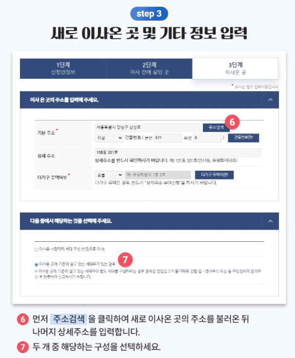 먼저 주소 검색을 클릭하여 새로 이사 온 곳의 주소를 불러오시고 나머지 상세주소를 입력합니다. 이후 두 개 중 해당하는 구성원을 선택합니다.
