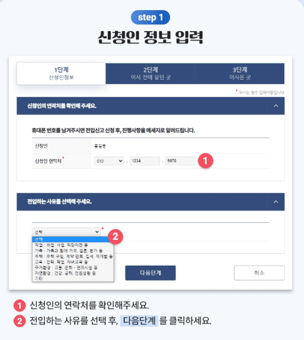 신청인 정보 입력에 신청인의 연락처를 입력하시고 전입하는 사유를 선택한 후 다음단계 버튼을 클릭합니다.