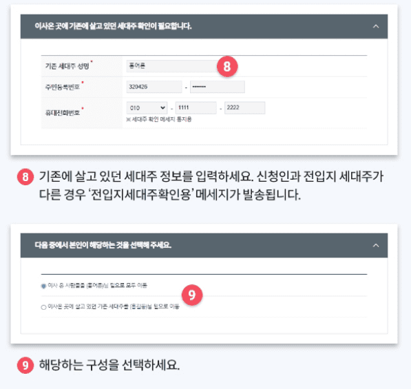 기존에 살고 있던 세대주 정보를 입력하시고 신청인과 전입지 세대주가 다른 경우 ‘전입지세대주확인용’ 메시지가 발송됩니다. 이후 해당하는 구성을 선택합니다.