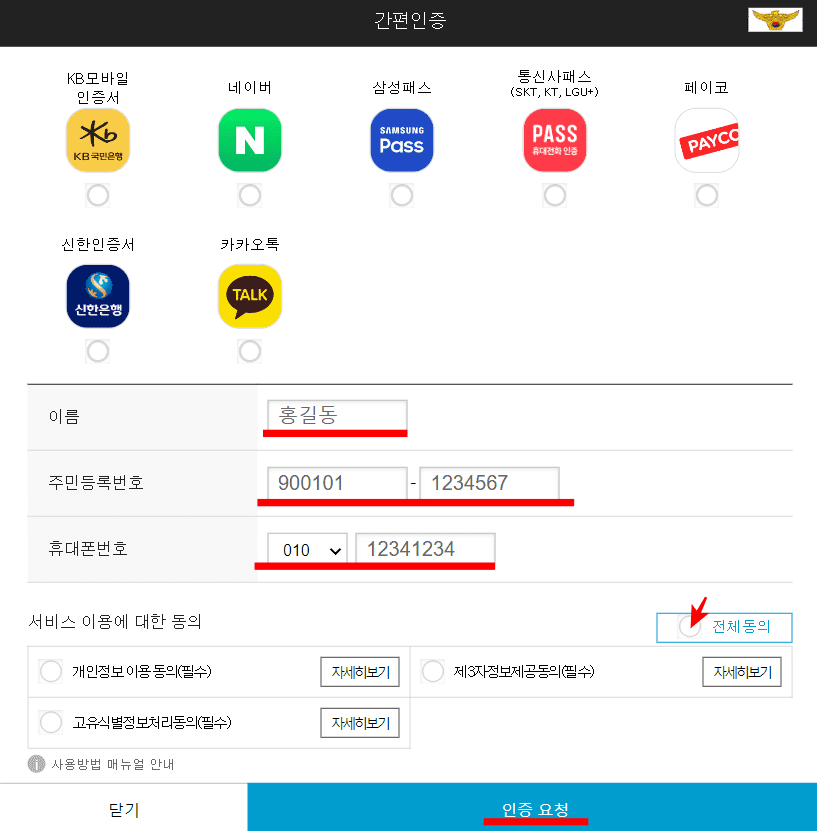 여기에서는 간편인증을 진행해 보았습니다. 먼저 간편 인증 수단을 선택하신 후 하단에서 개인정보 입력 후 서비스이용에 대한 전체 동의 후 인증 요청 버튼을 클릭합니다.