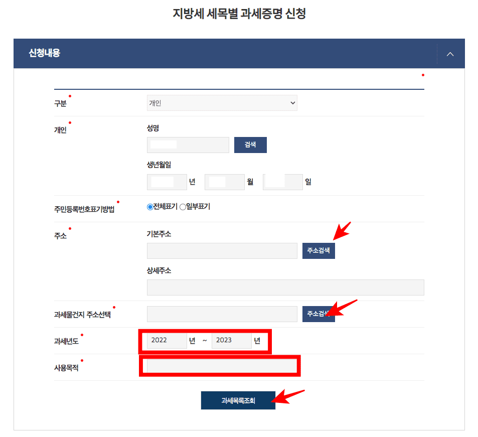 지방세 세목별 과세증명 신청 페이지가 표시되면 이름과 생년월일을 확인하시고 주소검색을 클릭하여 주소와 과세물건지 주소, 과세 연도, 사용목적을 입력합니다.