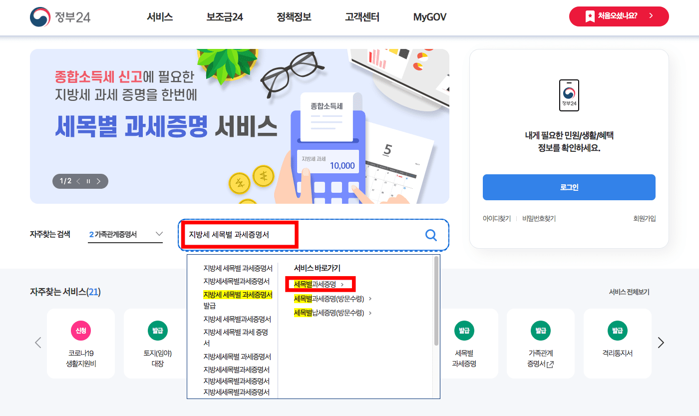 정부 24 홈페이지에 방문하시면 위와 같은 화면을 볼 수 있습니다. 검색창에 '지방세 세목별 과세증명서’를 입력하시고 서비스 바로가기에서 ‘세목별과세증명’을 클릭합니다.