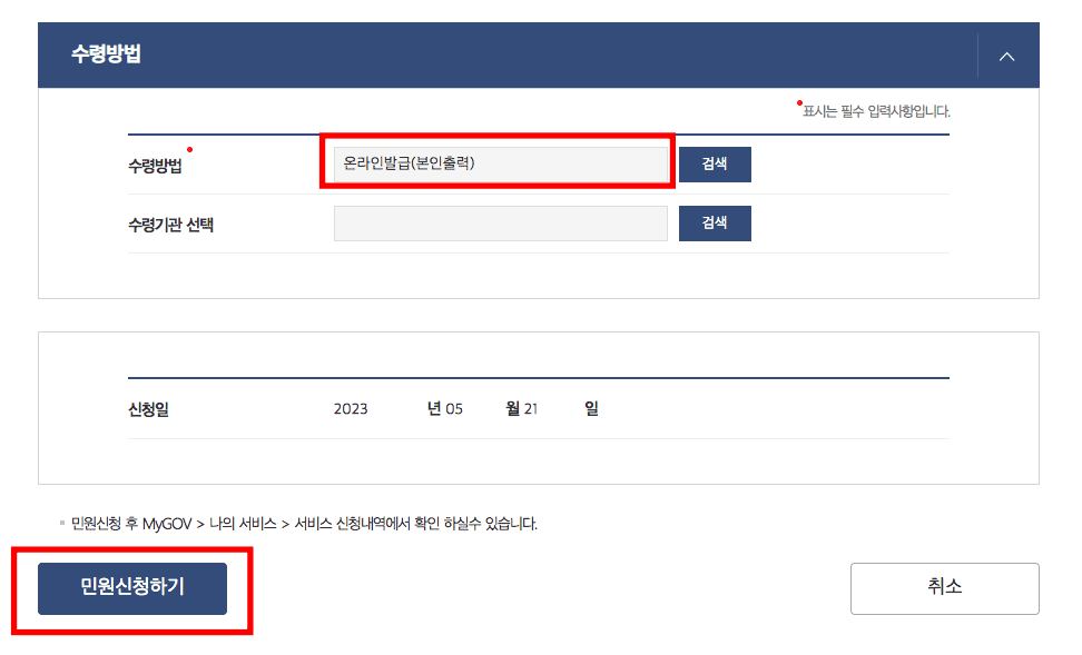 수령방법에서 온라인발급을 확인하시고 하단의 민원 신청하기 버튼을 클릭하면 지방세 세목별 과세증명서 인터넷발급이 완료됩니다. 서비스 내역조회에서 발급 버튼을 클릭하여 민원서류를 프린트하시면 됩니다.