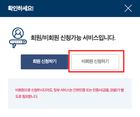 회원, 비회원 중 원하시는 인증 방법을 선택합니다. 여기에서는 비회원으로 진행해 보겠습니다.