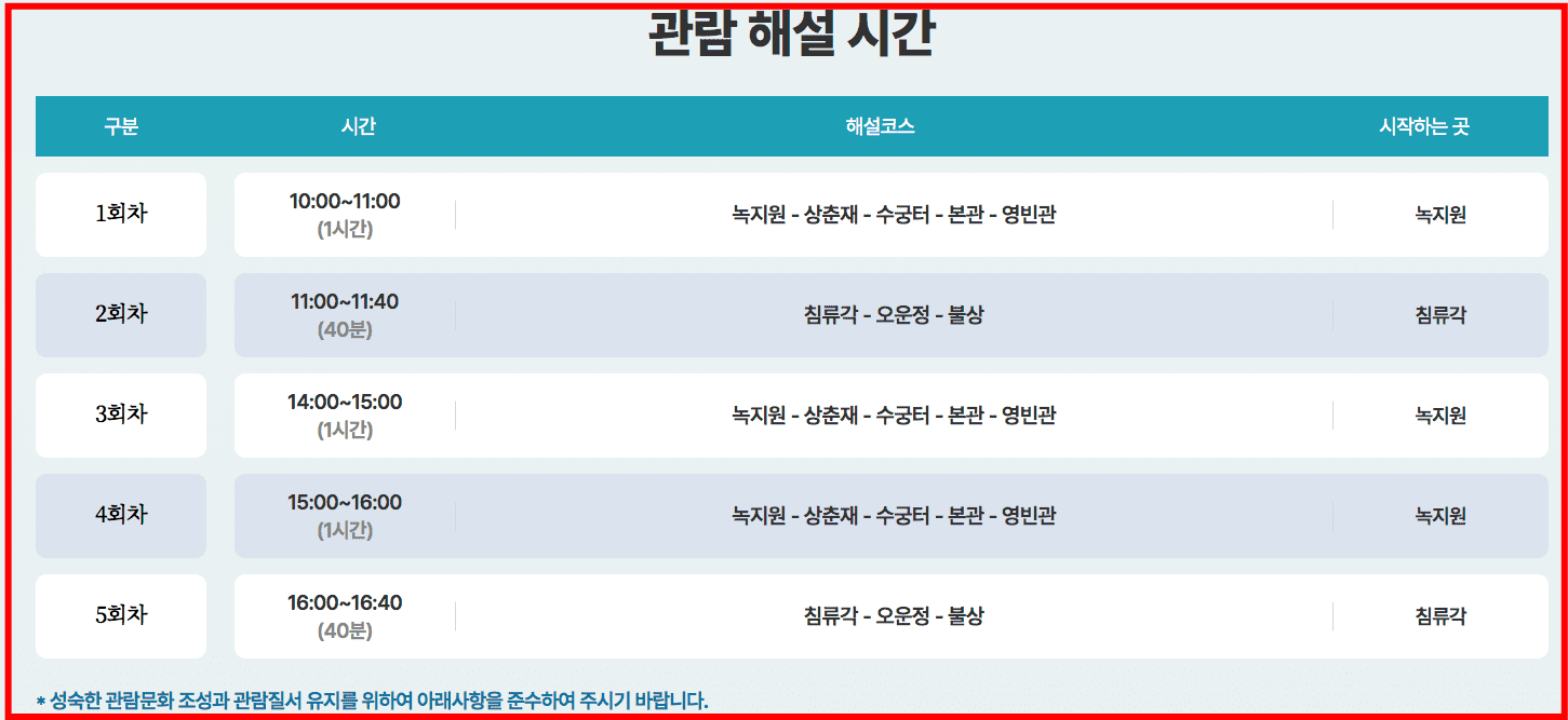 - 1회차 10:00~11:00 녹지원 - 상춘재 - 수궁터 - 본관 - 영빈관