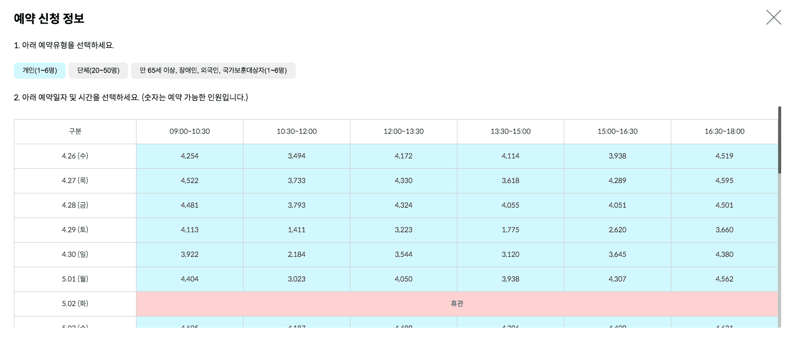 - 단, 화요일에는 개방하지 않습니다. 화요일이 공휴일 또는 대체공휴일과 겹치는 경우 화요일은 정상 개방되며 그다음 날이 휴관일이 됩니다.