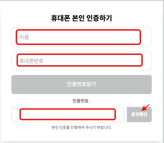 본인 인증 > 휴대폰 본인 인증하기 버튼을 클릭합니다. 이름과 휴대폰 번호를 입력하시고 인증번호 받기를 클릭하면 휴대폰으로 인증번호가 전송됩니다. 그 번호를 인증번호 란에 입력하시고 우측 문자확인 버튼을 클릭합니다.