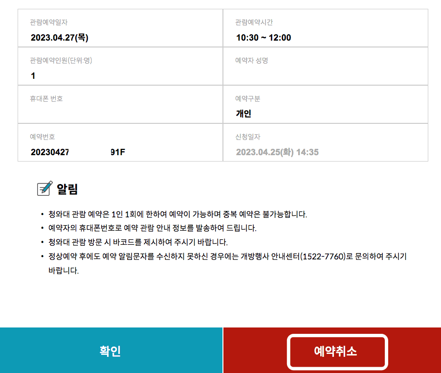 ‘관람신청 예약이 정상적으로 처리되었습니다.’ 라는 메시지와 하단에서 예약정보를 확인할 수 있습니다.