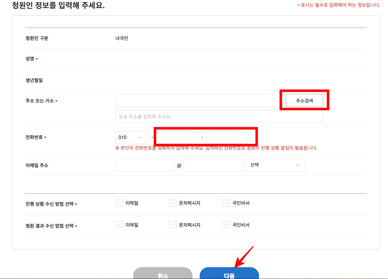 이후 다음 페이지에서 청원인의 정보를 입력합니다. 주소검색 버튼을 클릭하여 주소를 입력하고 전화번호를 입력합니다. 이후 진행상황 수신방법을 선택한 후 하단의 다음 버튼을 클릭합니다.