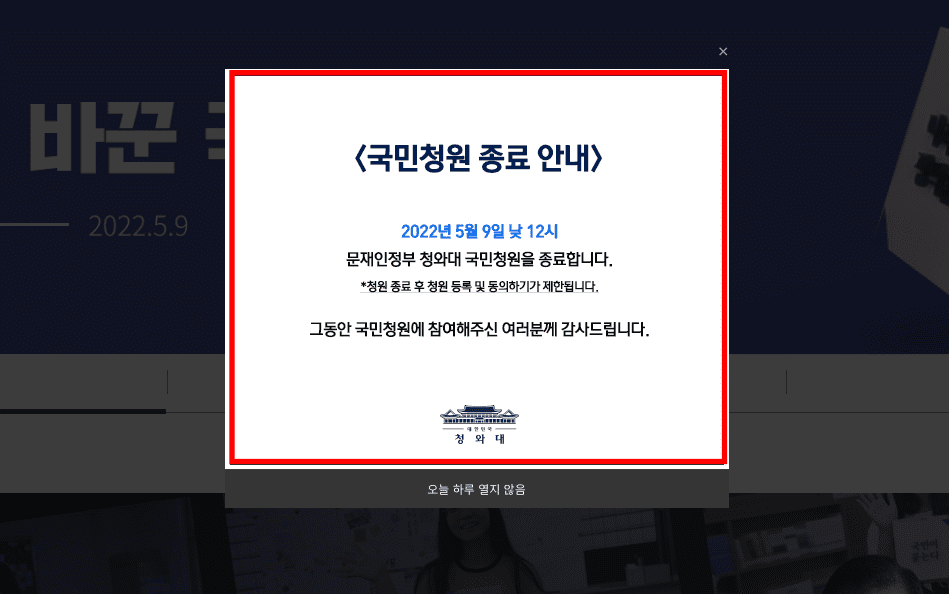 현재 청와대 국민청원홈페이지는 2022년 5월 8일 낮 12시를 마지막으로 종료되었음을 알 수 있습니다. 아래 링크를 통해 해당 사이트에 방문하실 수 있습니다.