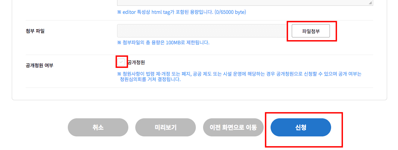 파일 첨부가 필요하다면 파일첨부 버튼을 클릭하여 첨부하시고 공개청원을 원한다면 공개청원을 체크합니다. 이후 신청 버튼을 클릭하면 신청이 완료됩니다.