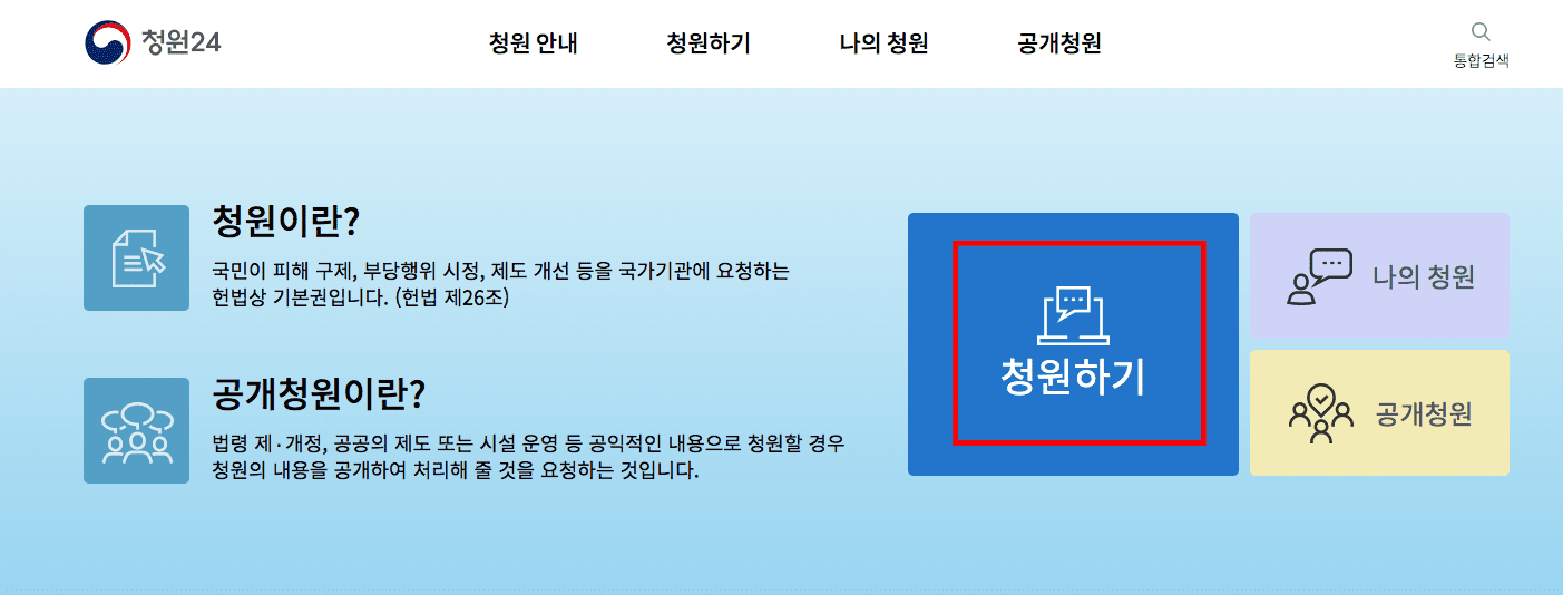 청원 24 홈페이지에 방문하시면 위와 같은 메인 화면을 볼 수 있습니다. 우측 청원하기 버튼을 클릭합니다.