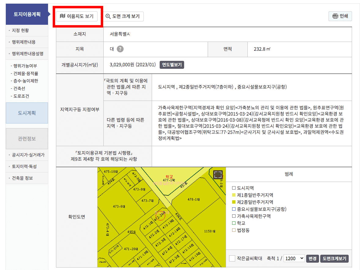 토지이용계획을 조회해 보시면 소재지와 개별공시지가, 지역지구등의 지정여부, 범례 등을 자세히 살펴볼 수 있습니다.